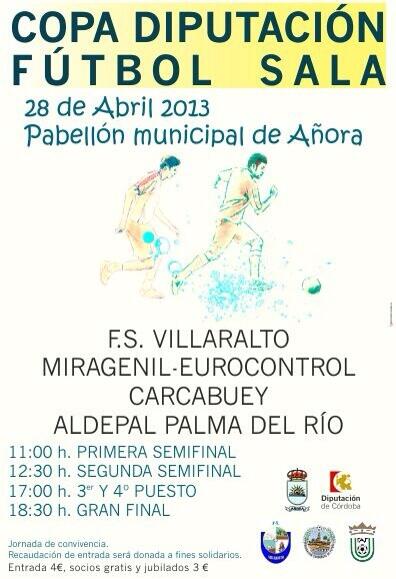 Este domingo se vivirá una intensa jornada de fútbol sala en el Pabellón Municipal de Deportes de Añora, sede elegida para disputar la Copa Diputación de Fútbol Sala 2013. Los partidos comenzarán a las 11:00 de la mañana y la gran final tendrá lugar a las 18:30 de tarde. Además, se celebrará una jornada de convivencia con paella donde la recaudación de la entrada se destinará a fines solidarios.